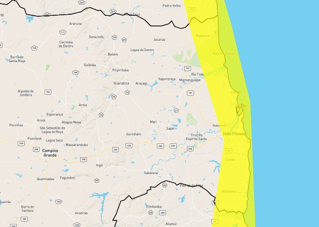 O Instituto Nacional de Meteorologia (Inmet) emitiu alerta de perigo potencial de chuvas intensas no Litoral da Paraíba. O alerta amarelo é válido até as 10h desta sexta-feira (24), dia de São João.