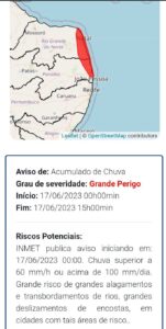 O Instituto Nacional de Meteorologia (Inmet) emitiu, na tarde desta sexta-feira (16), um novo aviso meteorológico, começando a zero hora deste sábado (17), com previsão de chuva forte, superior a 60 mm/h (milímetros/hora) ou acima de 100 mm/dia, com risco de grandes alagamentos, transbordamento de rios e deslizamentos de encostas. O alerta vermelho é válido até as 15h deste sábado.