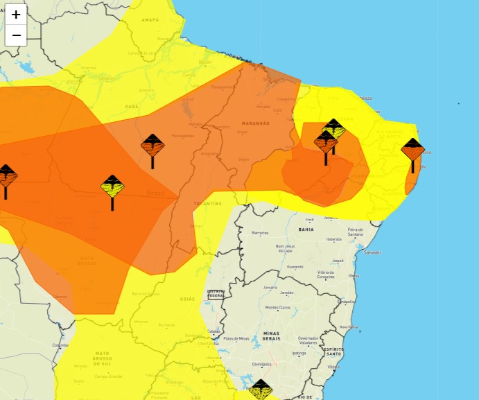 O alerta também prevê chuva entre 20 a 30 milímetros por hora ou até 50 milímetros por dia e ventos intensos entre 40 e 60 km/h nas cidades listadas. Existe baixo risco de corte de energia elétrica, queda de galhos de árvores, alagamentos e descargas elétricas.
