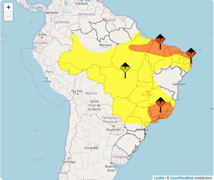 O segundo alerta laranja emitido pelo Inmet vale até amanhã e abrange 37 municípios: