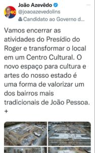 O governador e candidato à reeleição, João Azevêdo (PSB), anunciou, nesta quarta-feira (26), mais uma importante iniciativa para a cultura, lazer e formação de jovens em João Pessoa. A novidade se trata da instalação do Centro Cultural do Róger. O equipamento será instalado onde hoje funciona o Presídio Desembargador Flósculo da Nóbrega, que será desativado tão logo as obras da nova unidade prisional, que estão em ritmo acelerado de construção, sejam concluídas nas proximidades da PB-063.