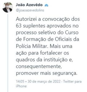 “Mais uma ação para fortalecer os quadros da instituição e, consequentemente, promover mais segurança”, escreveu o governador.
