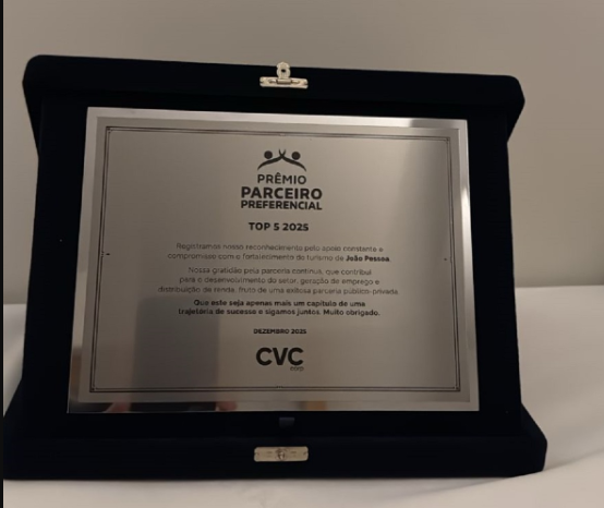 A desenvoltura da política de turismo desenvolvida pela Prefeitura de João Pessoa, por meio da Secretaria de Turismo, nos últimos anos têm colocado a Capital nas maiores e principais prateleiras das operadoras de turismo do Brasil. Na noite desta quarta-feira (10), o secretário-executivo de Turismo, Daniel Rodrigues, recebeu o Prêmio Preferencial Top 5, referente a 2025, conferido pela Operadora CVC Corp, em solenidade ocorrida na sede da empresa, em Santo André (SP).
