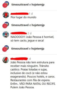 A publicação no entanto revelou um comportamento curioso e porque não dizer contraditório de parte dos moradores da capital paraibana. Nas redes sociais, muitos pessoenses foram até os comentários para ‘alertar’ turistas sobre supostos perigos e problemas da cidade. As alegações, que variam de uma criminalidade generalizada a praias impróprias para banho, demonstram mais um desejo de afastar visitantes do que um compromisso real com a verdade.