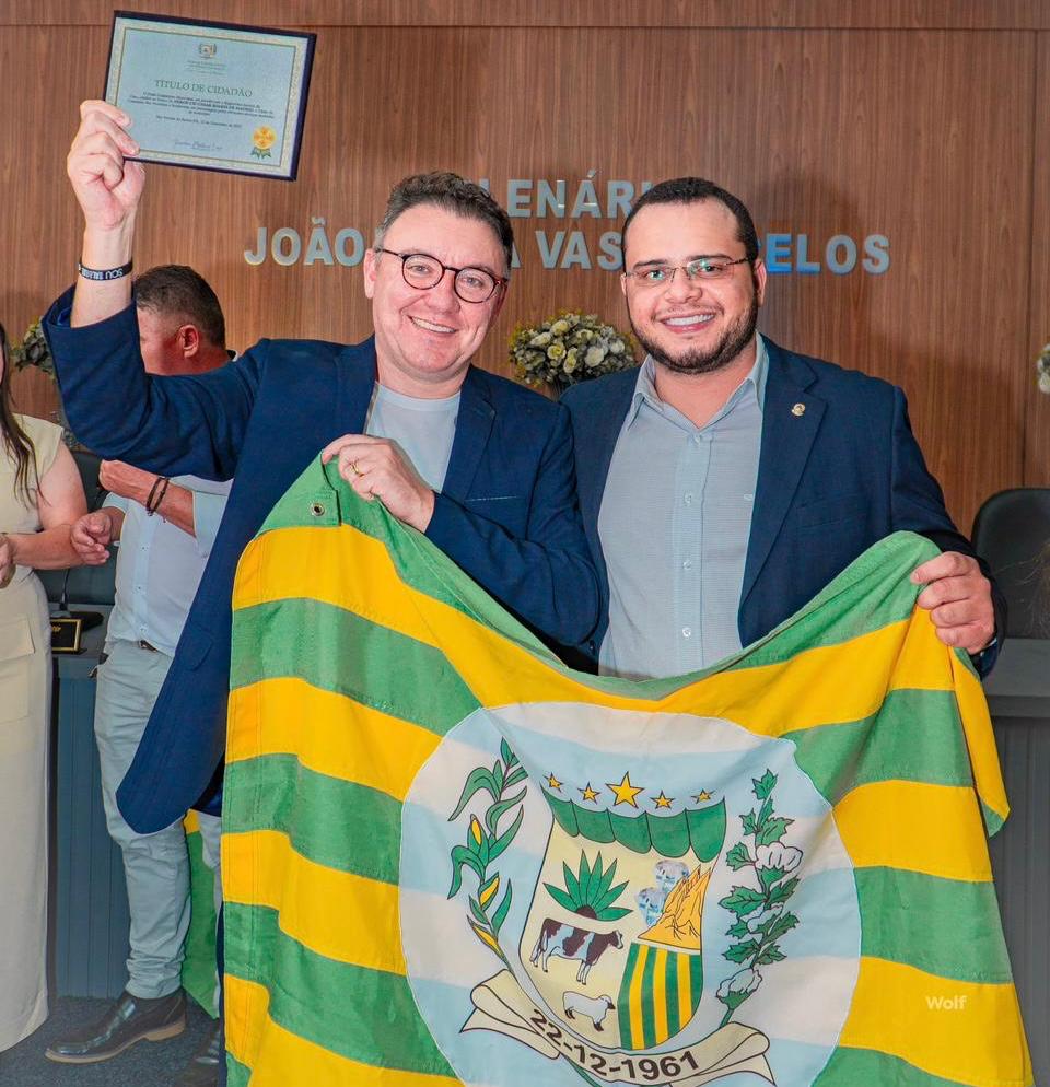 A homenagem também coincidiu com o aniversário de 63 anos de emancipação política do município. “Neste dia especial, 63 anos de emancipação, deixo de ser apenas um amigo e admirador, e passo, com orgulho, à galeria de filho adotivo. De agora em diante, a batalha de vocês é também minha trincheira. Contem com a força de minhas mãos e o eco de minha voz”, finalizou o jornalista.