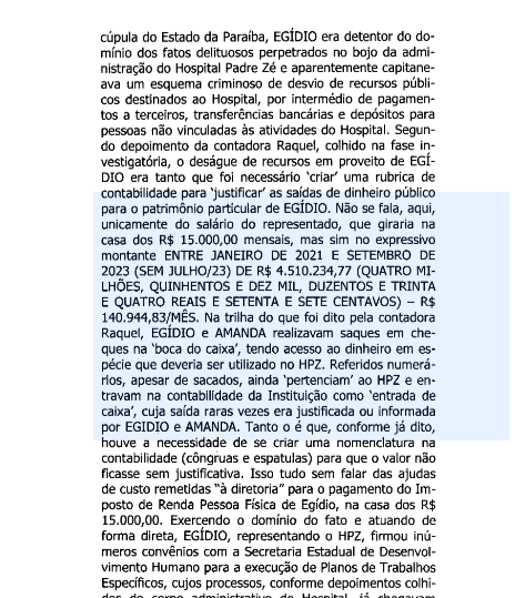 O Juiz Ricardo Vital de Almeida, em sua justificativa para o pedido de prisão de Padre Egídio, Amanda Duarte Silva Dantas e Jannyne Dantas Miranda e Silva (as duas ex-diretoras do Hospital Padre Zé) expôs que o montante desviado por eles ultrapassou a marca de R$ 4,5 milhões em menos de três anos.
