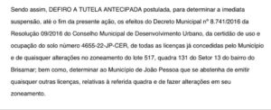 O prédio chamado Mirante Ruy Carneiro estaria sendo erguido em uma zona ambiental de preservação permanente. Em sua decisão, a magistrada determinou o cumprimento imediato e com urgência da suspensão das obras, alegando que “o perigo da demora é iminente, diante dos prejuízos que poderão advir ao meio ambiente e coletividade com a obra em questão”, escreveu.