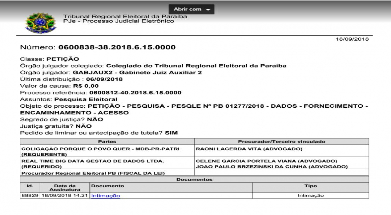 O juiz da Propaganda Eleitoral do TRE-PB, Keops de Vasconcelos Amaral Vieira Pires, determinou o pagamento de multa de R$ 10 mil, pela empresa Real Time Big Data, que realizou e divulgou pesquisa de opinião pública, sem fornecer informações que comprovem sua transparência e veracidade. A multa pode ser diária e até aumentar de valor, segundo a Justiça, em caso de descumprimento da decisão. O requerimento de acesso ao sistema de controle para verificação e fiscalização sobre a coleta dos dados foi feito pela Coligação “Porque o Povo Quer”. Além da decisão do TRE-PB, o Ministério Público Eleitoral na Paraíba, por determinação do procurador Rodolfo Alves Silva, vai instaurar procedimento para apurar a ocorrência de crimes eleitorais.