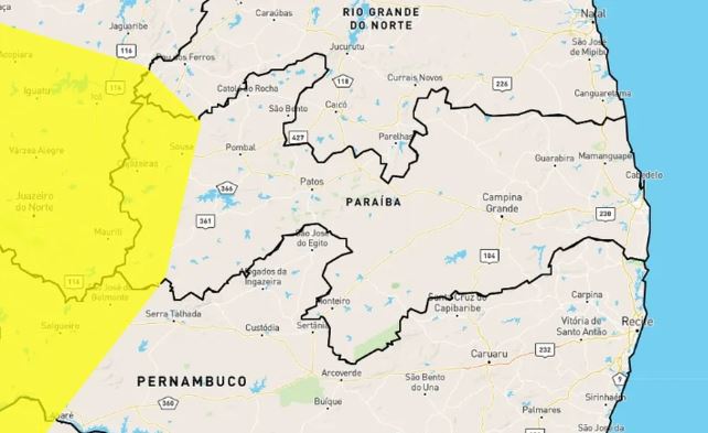 Na tarde desta sexta-feira (20), o Instituto Nacional de Meteorologia (Inmet) emitiu um alerta de perigo potencial de chuvas intensas para 31 cidades do Sertão da Paraíba. De acordo com o órgão, o aviso vale até 10h do sábado (21).
