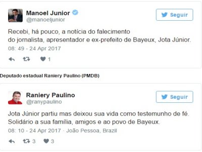 Depois do prefeitos de João Pessoa e Campina Grande, outros políticos paraibanos também se manifestaram, através de suas assessorias de imprensa, para lamentar a morte do apresentador e ex-prefeito Jota Júnior, que lutava por um transplante de pulmão.