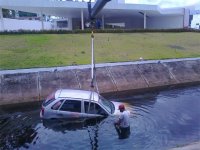 Segundo Djalma, o freio de mão estava acionado, mas isso não impediu a descida. O acidente aconteceu no canal que passa por dentro do Shopping do Automóvel, às margens da BR-230. Por volta das 13h40 o carro já estava sendo removido.