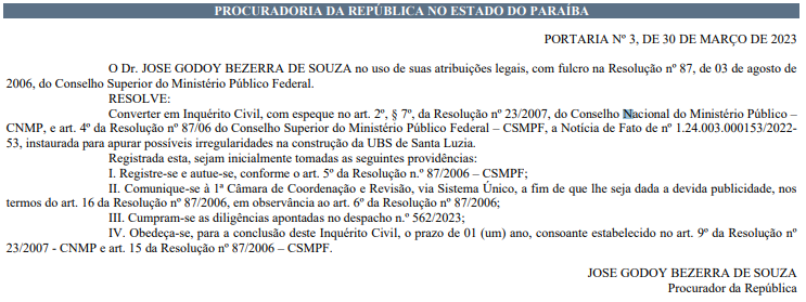 O Ministério Público instaurou um inquérito civil para investigar possíveis irregularidades na construção da Unidade Básica de Saúde (UBS) em Santa Luzia. A medida foi tomada pelo procurador federal Jose Godoy Bezerra de Souza, com base na Resolução nº 87 do Conselho Superior do Ministério Público Federal.