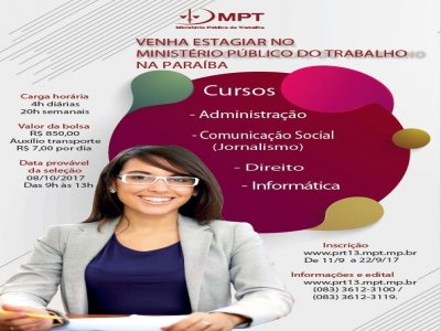 Podem se inscrever estudantes dos cursos de Administração, Comunicação Social, Direito e Informática, de instituições de ensino superior conveniadas com o MPT-PB.