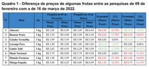 Em relação às frutas, no quilograma da acerola, e o menor valor pode ser adquirido por R$ 3,99 (Supermercado IOB – Manaíra) e o maior valor por R$ 11,20 (Superbox Brasil – Jardim Oceania). A variação ficou em torno de 180,70%.