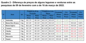 Referente às verduras, com variação de 66,75%, o quilo do repolho roxo, os valores oscilaram entre R$ 8,39 (Superbox Brasil – Jardim Oceania) até R$ 13,99 (Supermercado Santo Andre -Cruz das Armas).