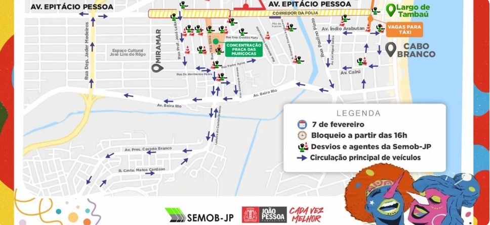 A Via Folia, no trecho a partir da bifurcação com a Av. Rui Carneiro e Av. Tito Silva, será bloqueada no sentido Centro-Praia a partir das 10h, com as equipes operacionais orientando o posicionamento dos trios elétricos. Às 18h, com o aumento da demanda de foliões, será iniciada as intervenções e desvios para o bloqueio total da Via Folia, incluindo a Praça das Muriçocas, com proibição de acesso dos veículos particulares e do transporte coletivo.