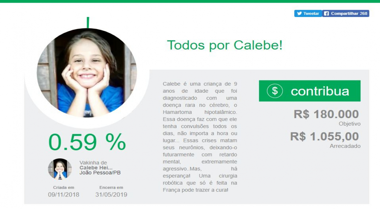 Uma corrente de solidariedade foi formada por uma família, na Paraíba, em busca da sobrevivência de uma criança, de 9 anos, que foi diagnosticada com uma doença rara no cérebro. Nas redes sociais Calebe, como é chamado o menino, já conseguiu arrecadar R$ 1.055,00, mas o objetivo e chegar a R$ 180 mil.