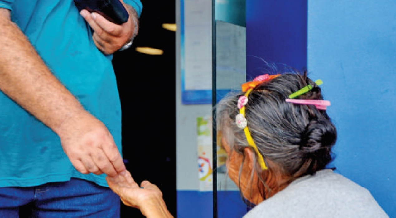 Dona Maria da Paz de Souza nasceu no Sertão paraibano. Há bem mais de 10 anos fica das 7h às 16h na porta da Caixa Econômica Federal, localizada na Avenida Miguel Couto, Centro de João Pessoa. No rosto e nas mãos, as marcas de quem está prestas a completar 72 anos de idade passam a ideia de fragilidade, negada pelo corpo que diariamente insiste em se manter firme.