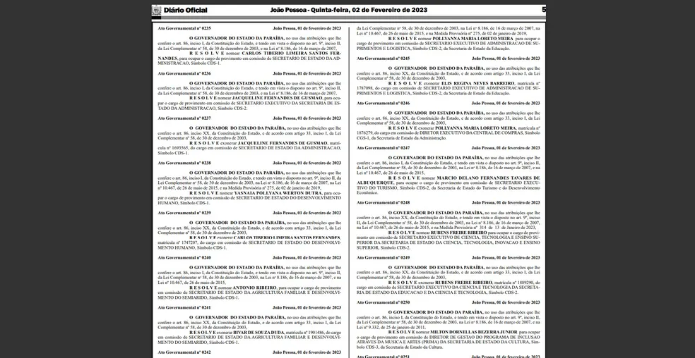 Ao todo, três novos secretários de estado que já haviam sido anunciados pelo governador João Azevêdo em janeiro foram nomeado. Além das nomeações de Tibério Limeira, Pollyana Dutra e Frei Anastácio, o DOE-PB também traz a nomeação de alguns secretários executivos do estado.
