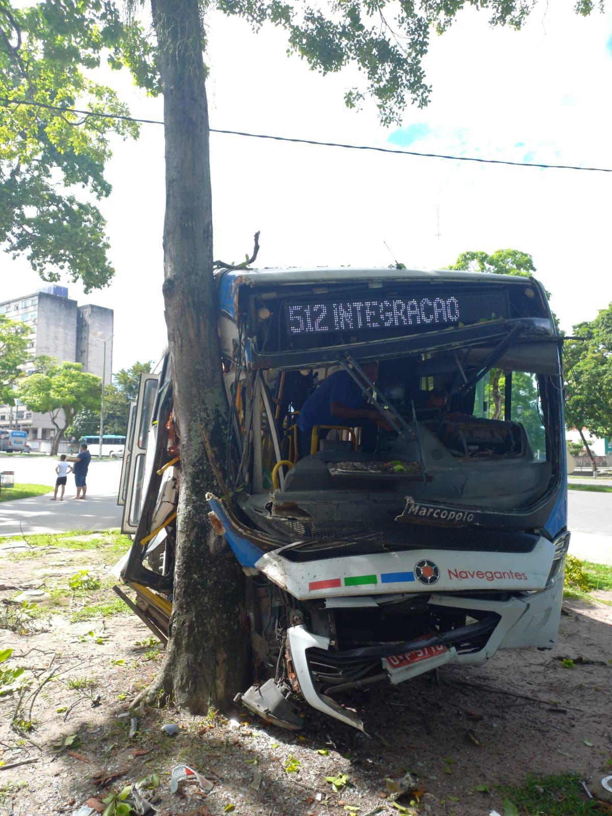 O ônibus, operando sem passageiros, colidiu primeiramente contra alguns veículos antes de bater em uma árvore próxima à via.