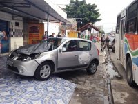 Informações dão conta de que ao entrar na avenida, o condutor de um veículo Renault Sandero na cor prata perdeu o controle e bateu no ônibus.