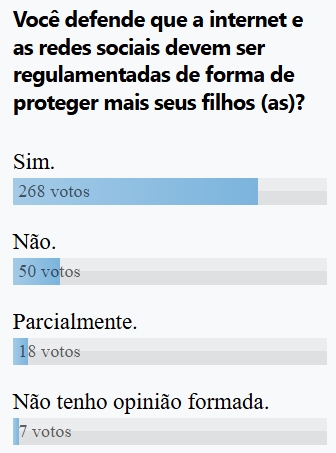 A enquete do PB Agora perguntou aos leitores se eles defendem que a internet e as redes sociais devem ser regulamentadas de forma de proteger mais seus filhos. Com base no número de pessoas que responderam ao questionamento, 78% disseram ser a favor da regulamentação.