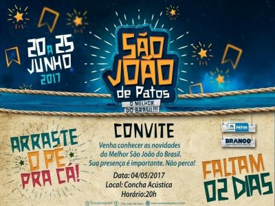Na 21ª edição do São João de Patos, segundo o prefeito Dinaldinho Wanderley, população e turistas vão desfrutar do novo jeito de fazer o mais importante festejo da cidade. Será uma programação diversificada, tanto no Terreiro do Forró, quanto nas inovações que serão implementadas, com destaque para a Vila São João, o polo Gastronômico Cultural e muitas outras novidades que serão anunciadas no evento de quinta-feira.