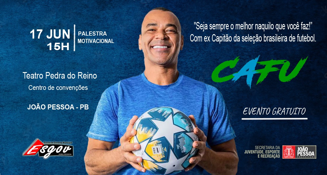 O ex-jogador e capitão da Seleção Brasileira de Futebol na conquista do pentacampeonato mundial de futebol, Cafu, ministra palestra gratuita, às 15h desta segunda-feira, em João Pessoa, no teatro Pedra do Reino, no Centro de Convenções. A apresentação acontece durante o Congresso Técnico Esportivo Motivacional da Escola de Governo Municipal (Esgov), da Prefeitura de João Pessoa.