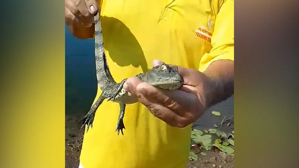 As imagens mostram o pescador Damião Lira segurando o animal, pelo pescoço. Ele conta que chegou a ver pelo menos dois jacarés, enquanto pescava, e que conseguiu capturar o filhote. Além de mostrar para as pessoas o animal, o vídeo mostra também o momento em que ele devolve o filhote de jacaré para o açude.