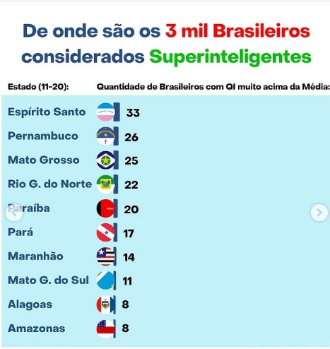 Em 2022, o Brasil havia alcançado 2 mil superinteligentes, conforme a postagem de 19/10/2023. Desde então, ao menos mais mil superinteligentes foram encontrados no país. Na Paraíba, existem 20 superdotados.