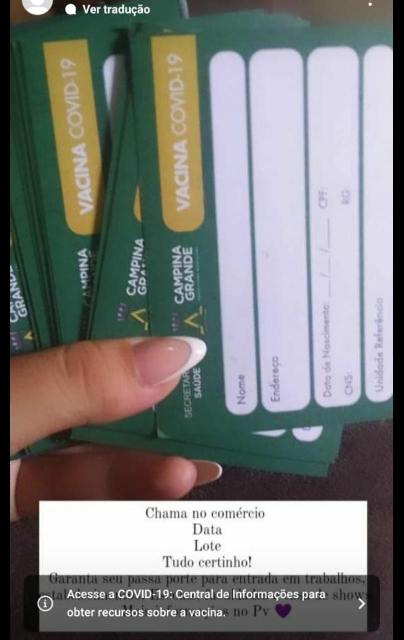 A Secretaria de Saúde de Campina Grande foi informada nesta segunda-feira, 4, sobre uma denúncia de venda de cartões de vacinação da covid-19 no município. De acordo com a denúncia realizada em emissoras de rádio, os cartões, com a mesma identidade do cartão vacinal da cidade, estariam sendo comercializados nas redes sociais e na Feira da Prata.