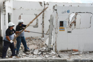 A Prefeitura Municipal, por meio do Programa João Pessoa Sustentável, realizou, nesta quarta-feira (15), a demolição de 8 imóveis em risco iminente de desmoronamento na Comunidade Santa Clara, no bairro Castelo Branco. A ação emergencial, que teve a frente a Coordenadoria Municipal de Proteção e Defesa Civil (Compdec), se deu em função das últimas chuvas que causaram instabilidade na barreira que margeia a BR 230. Durante os trabalhos, a rodovia foi interditada pelo Departamento Nacional de Infraestrutura de Transportes (Dnit), no sentido João Pessoa/Cabedelo, sob supervisão da Polícia Rodoviária Federal (PRF).
