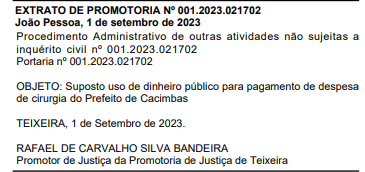 O prefeito do município de Cacimbas, Nilton de Almeida, do PSDB, entrou na mira da justiça suspeito de usar o dinheiro público da cidade para pagamento de despesas de cirurgia. A instauração do Procedimento Administrativo nº 001.2023.021702 para apurar o caso foi determinada pelo promotor de Justiça, Rafael de Carvalho Silva Bandeira,