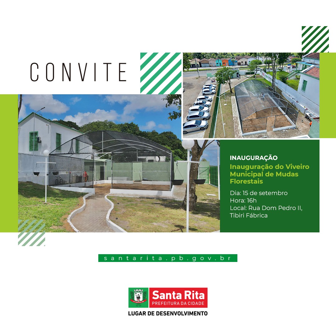 A Prefeitura Municipal de Santa Rita realiza a entrega da maior obra do Meio Ambiente já realizada. O Viveiro Municipal de Mudas Florestais, que será entregue no próximo dia 15 de setembro, às 16h, fica localizado nas imediações da Secretaria de Meio Ambiente (SEMMA), na Avenida Dom Pedro II, Tibiri Fábrica – Santa Rita. Um espaço de cultivo de plantas ornamentais e árvores, que será destinado a arborização e harmonização paisagística de praças, áreas verdes e canteiros de ruas, com objetivo de proporcionar embelezamento e valorização dos aspectos naturais da cidade.