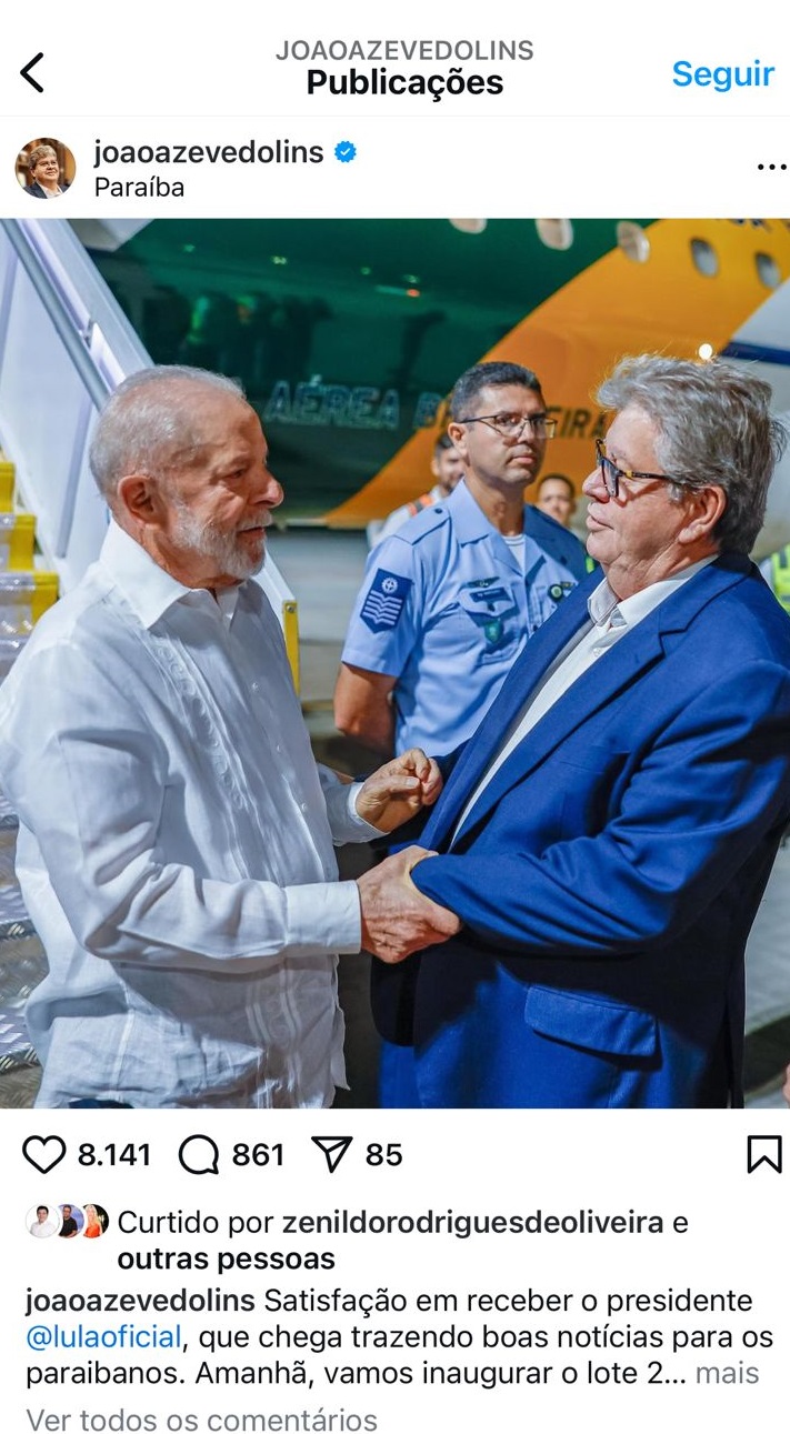 O presidente Luiz Inácio Lula da Silva (PT) desembarcou na noite de ontem (29) no aeroporto Castro Pinto, em João Pessoa. Fazia sete anos que Lula não vinha a capital paraibana. O presidente foi recebido pelo governador João Azevêdo (PSB).
