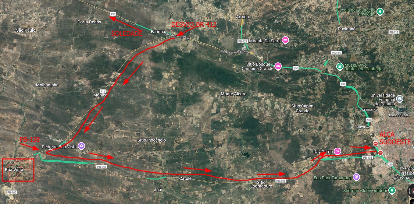 A PRF implementou um desvio na BR-230 no trecho entre Soledade e Campina Grande nesta quinta-feira (15) devido ao transporte do transformador de energia para o parque eólico de Nova Palmeira. Motoristas que trafegam no sentido Soledade-Campina Grande devem seguir pela BR-412 até Boa Vista e depois pela PB-138 até a alça sudoeste da Rainha da Borborema.