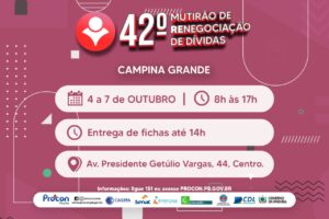 A Autarquia de Proteção e Defesa do Consumidor, PROCON-PB realizará o 42º Mutirão de Renegociação de Dívidas. O Mutirão será realizado de 8h às 16h, nos dias 4 à 7 de outubro, na Av. Presidente Getúlio Vargas, 44, no centro da cidade de Campina Grande.