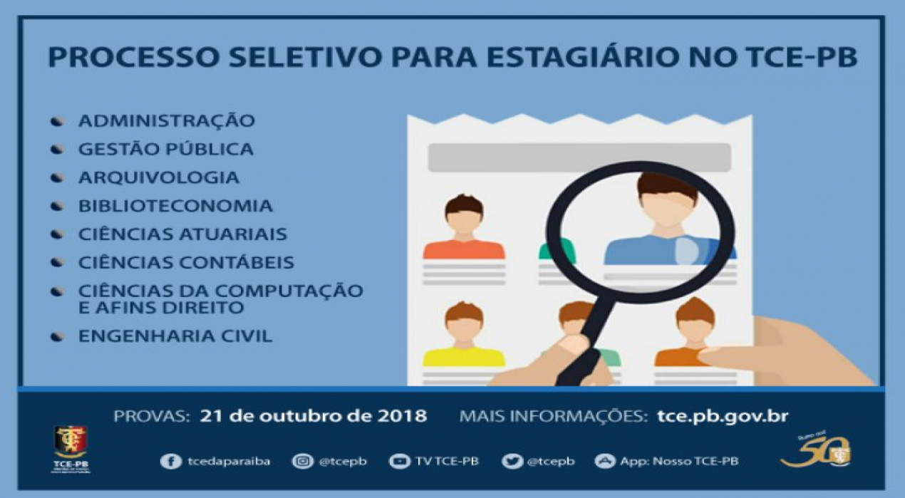 Com inscrições feitas até 30 de setembro, e já devidamente homologadas, 3.561 candidatos às vagas de estágio de nível superior no Tribunal de Contas da Paraíba realizarão provas no próximo dia 21 deste mês de outubro, conforme edital publicado em 18/09/2018, na edição nº 2043 do Diário Oficial Eletrônico do TCE-PB.