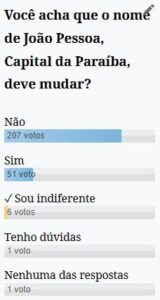 Apenas 19% se posicionaram de forma favorável à mudança do nome da Capital, que entre outros nomes já se chamou Filipéia, Filipéia de Nossa Senhora das Neves, Frederica e Parahyba