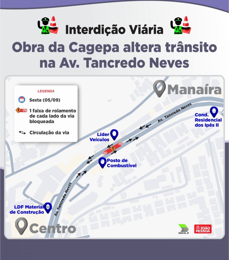 A Superintendência Executiva de Mobilidade Urbana de João Pessoa (Semob-JP) informa que, a partir desta semana, haverá alteração no tráfego de veículos na Avenida Presidente Tancredo Neves, em razão de uma obra executada pela Companhia de Água e Esgotos da Paraíba (Cagepa).
