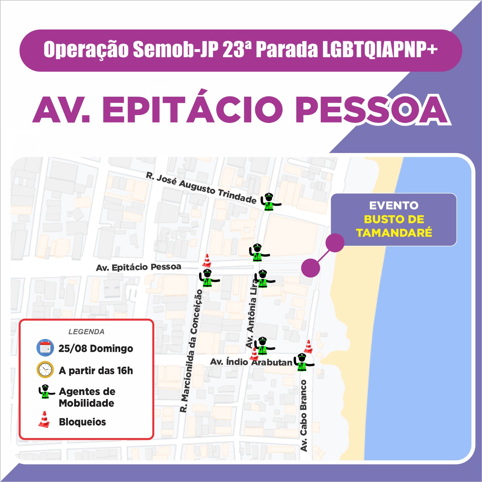 A Superintendência Executiva de Mobilidade Urbana de João Pessoa (Semob-JP) vai monitorar todo o entorno do evento, durante as apresentações artísticas e musicais da 23ª Parada LGBTQIAPN+, neste domingo (25). A organização do evento definiu o início a partir das 15h e o encerramento à meia-noite, no Busto de Tamandaré.