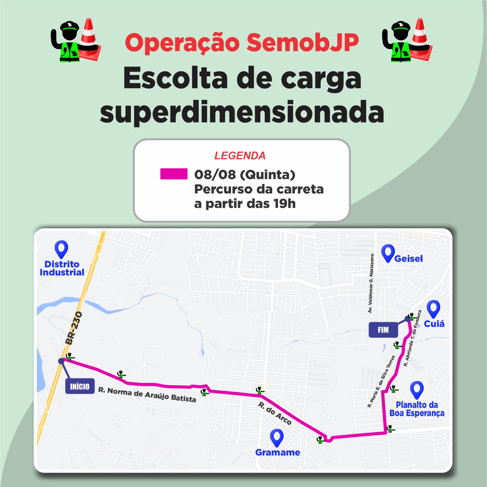 Entre o percurso planejado, está a circulação pelas ruas Norma de Araújo Batista (Distrito Industrial), Engenheiro Elson Gouveia Falcone (Grotão), Arco (Gramame), Alberto de Miranda Henriques (Gramame), Epitácio Costa do Amaral (Gramame), Maria Emília da Silva Torres (Gramame) até a parada final para içamento da caixa d’água em um condomínio na Avenida Abelardo Targino da Silva (Cuiá).