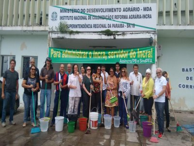 Munidos de baldes, vassouras e sabão em pó, os servidores da Superintendência do Instituto Nacional de Colonização e Reforma Agrária (Incra) na Paraíba fizeram uma lavagem simbólica da calçada do prédio, em João Pessoa, na manhã desta quarta-feira (29). O ato, contra a corrupção e a ingerência política no órgão e em defesa da indicação de servidor efetivo da Autarquia para o cargo de superintendente regional e da reestruturação das carreiras dos servidores, foi organizado pela Associação dos Servidores do Incra da Paraíba (Assincra/PB) e pelo Sindicato Nacional dos Peritos Federais Agrários (SindPFA).