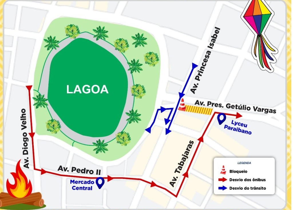 Para que o trabalho de montagem do palco seja iniciado, será bloqueado o cruzamento entre as avenidas Getúlio Vargas e Princesa Isabel, sentido Centro/praia, sendo que o sentido oposto seguirá com fluxo mantido normalmente. Com isso, quem segue pela Avenida Princesa Isabel, apenas poderá transitar em frente cruzando a Avenida Getúlio Vargas, sentido Avenida Pedro II. Já quem seguir do Parque Solon de Lucena só poderá acessar à direita na Avenida Princesa Isabel para a Avenida Pedro II (Mercado Central). Já o transporte coletivo urbano irá pela Avenida Diogo Velho (Pedro II), retornando pela Avenida Getúlio Vargas, próximo ao Lyceu Paraibano.