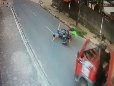 Uma colisão envolvendo um ciclista e um motociclista, na tarde de ontem, terça-feira (21), foi registrada pelo circuito de câmeras de uma residência. Nas imagens é mostrado o momento em que os dois veículos se chocam e um caminhão caçamba quase atropela a dupla.