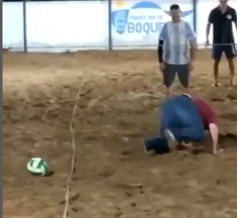 Nas imagens é possível ver que Marcos Freitas tenta pegar uma bola e se desequilibra, caindo com o rosto na areia.