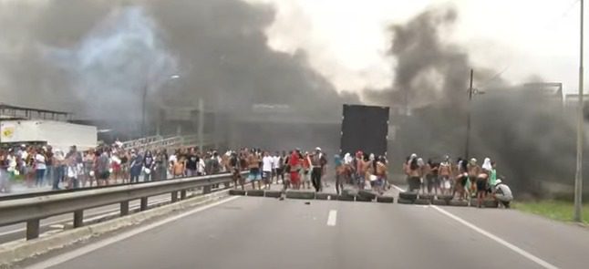 Fogo, fumaça e bloqueio. E trânsito parado. Um protesto de grande proporção está interditando trechos das BRs 101 e 230 neste momento, na altura do km 87 da BR 101, no bairro Jardim Veneza. As vias laterais da BR estão todas bloqueadas e um enorme engarrafamento começa a se formar. Os manifestantes pedem justiça pela morte brutal dos dois jovens.