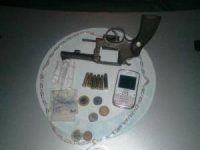 B.S.N.,16 anos, G.T.C., 17, estavam de posse de um revólver calibre 38 com seis munições intactas, 02 doi) celulares, R$ 11,00 três papelotes de maconha.´