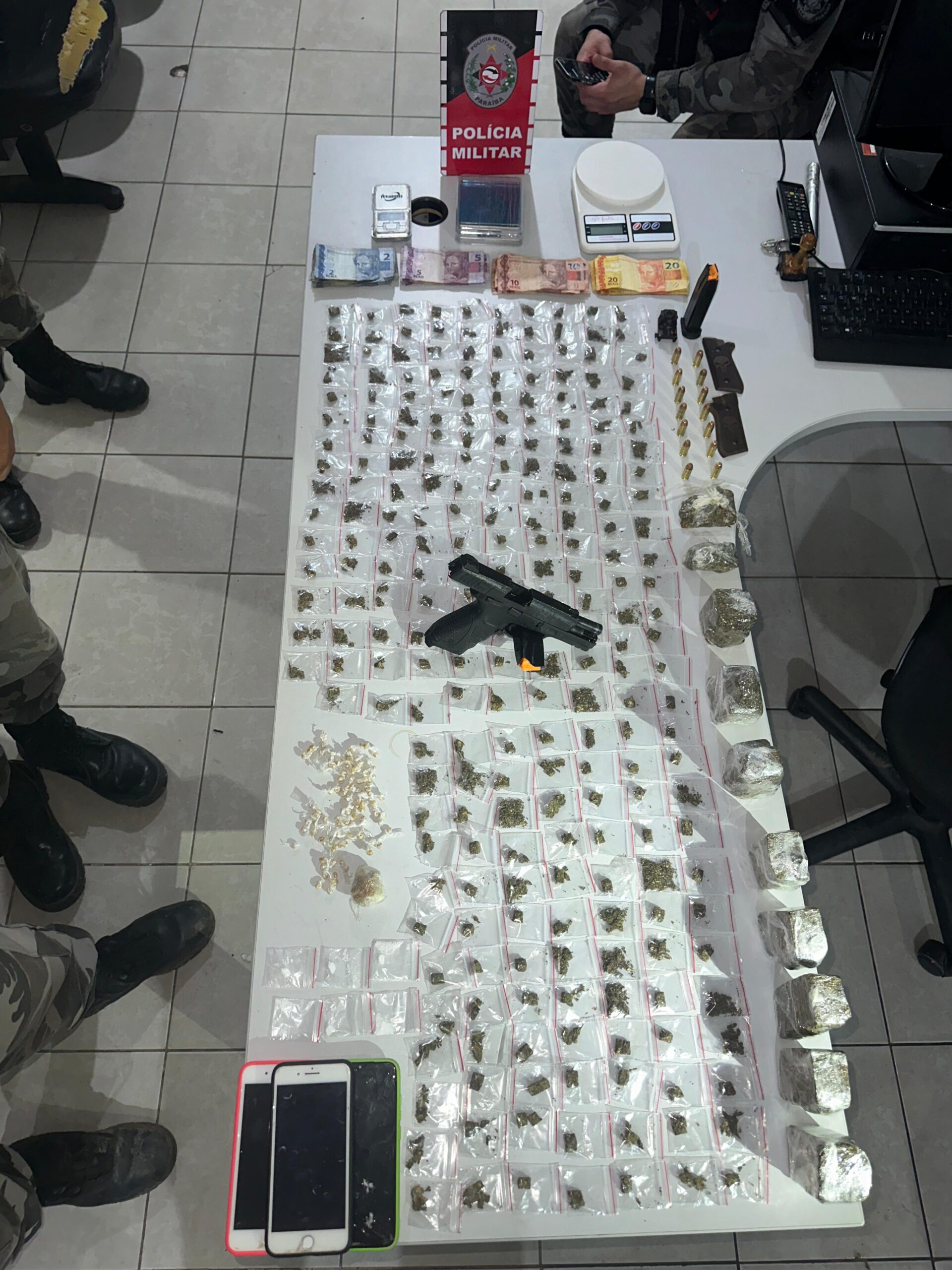 De acordo com o 7º Batalhão, unidade responsável pela ação, os acusados foram flagrados pela Força Tático no local conhecido como “Rua do Rato”, no bairro Popular, em Santa Rita. Houve confronto com os bandidos e prisão dos acusados. Na região, os policiais apreenderam 364 porções de maconha, crack, cocaína, uma pistola, munições, mira laser, balanças de precisão, dinheiro e celulares.