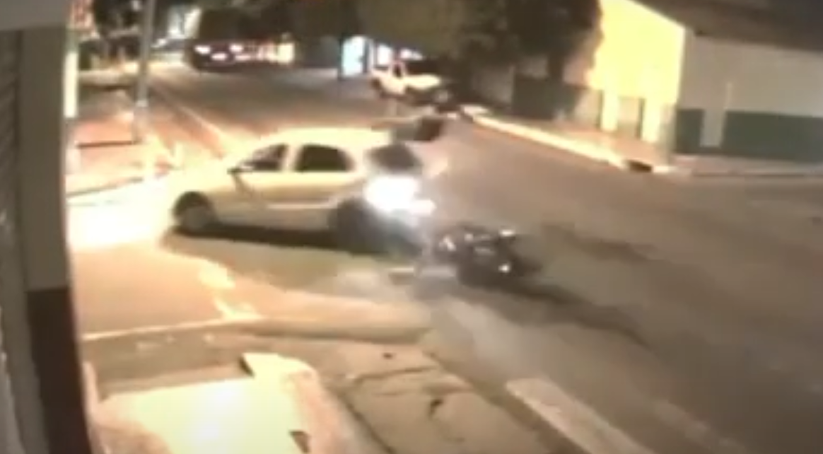 O vídeo mostra quando um carro e uma moto seguem no mesmo sentido e quando o automóvel ultrapassa a faixa e faz uma manobra. O condutor da moto não consegue frear a tempo e bate o carro. Com o impacto, o motociclista é arremessado para o acostamento.
